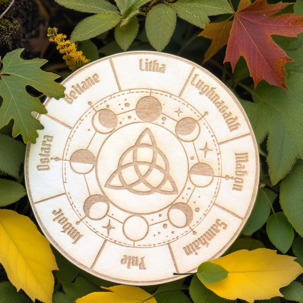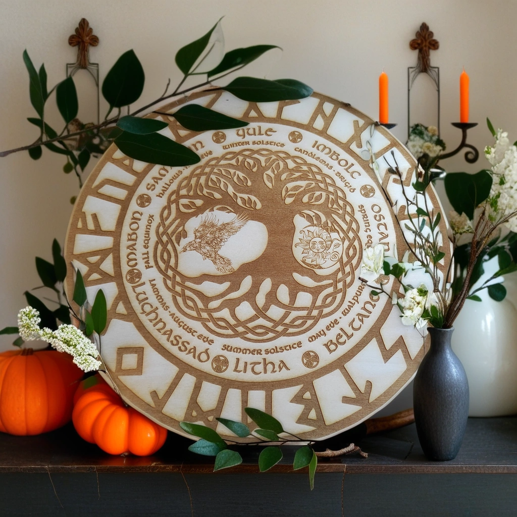 Если вы хотите, чтобы ваш обряд имел «центр» — используйте Колесо года с чёткой символикой восьми поворотов. Положите его на алтарь или под венок — оно создаёт ощущение времени, которое движется вместе с вами.