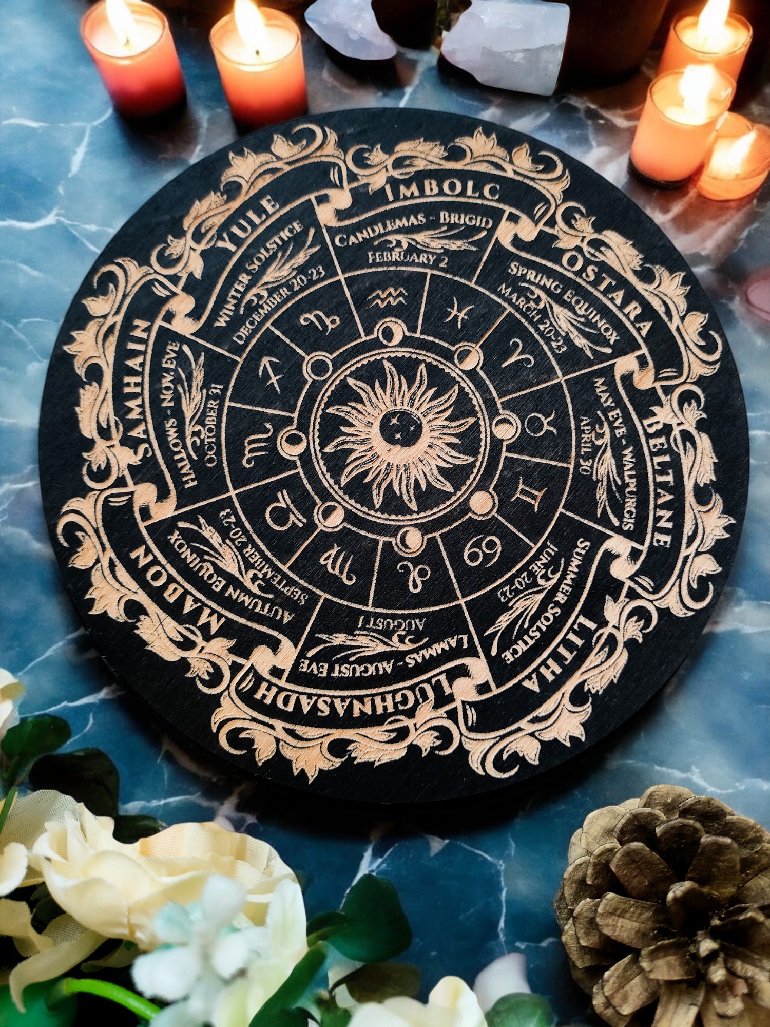 Разместите в центре Колесо года с мощным огненным рельефом — оно задаёт ритм и якорит обряд. Особенно красиво оно смотрится на фоне живых цветов и свечей.