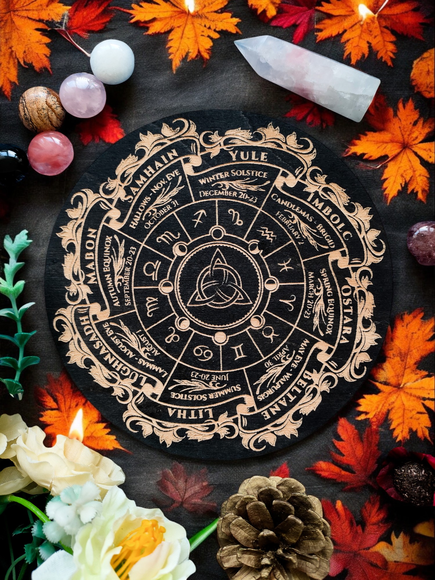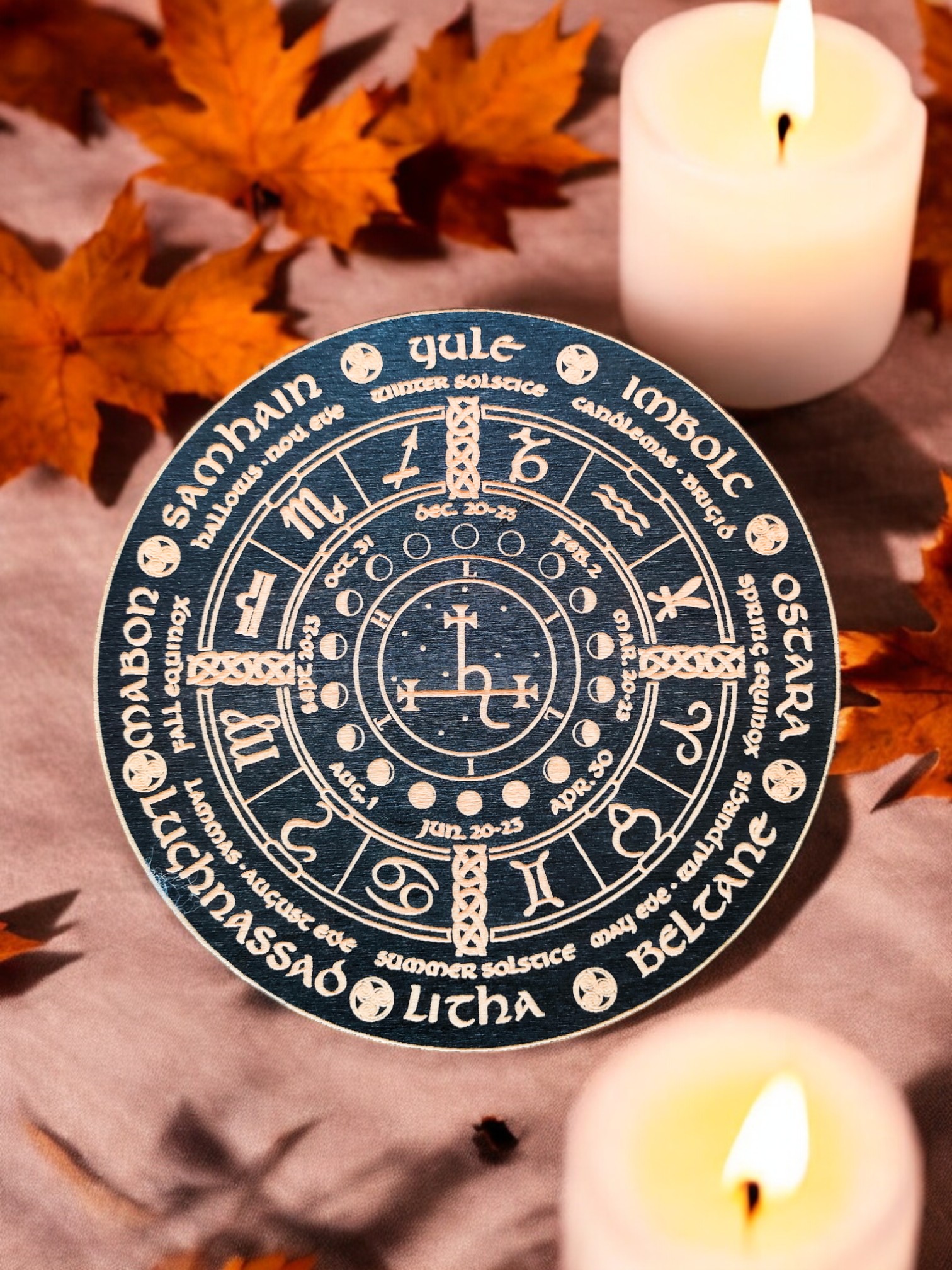 На алтарь хорошо подойдёт гравированное Колесо с чётким символизмом и глубоким визуальным акцентом на переходе. Его можно разместить в центр алтаря, окружив огнями, черепами, листьями или камнями — оно станет якорем и точкой концентрации в самую важную ночь года.